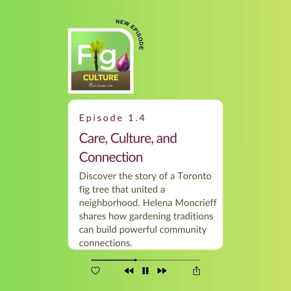Helena shares the story of Francesco, a gardener whose towering backyard fig tree became the heart of an annual tradition. Each fall, neighbors, friends, and even strangers would gather to help perform the ritual of tipping the tree over to protect it through the winter. Or, later, as it got bigger, to help him wrap it. Lots of heavy work, but a shared act of growing food and cultural heritage.