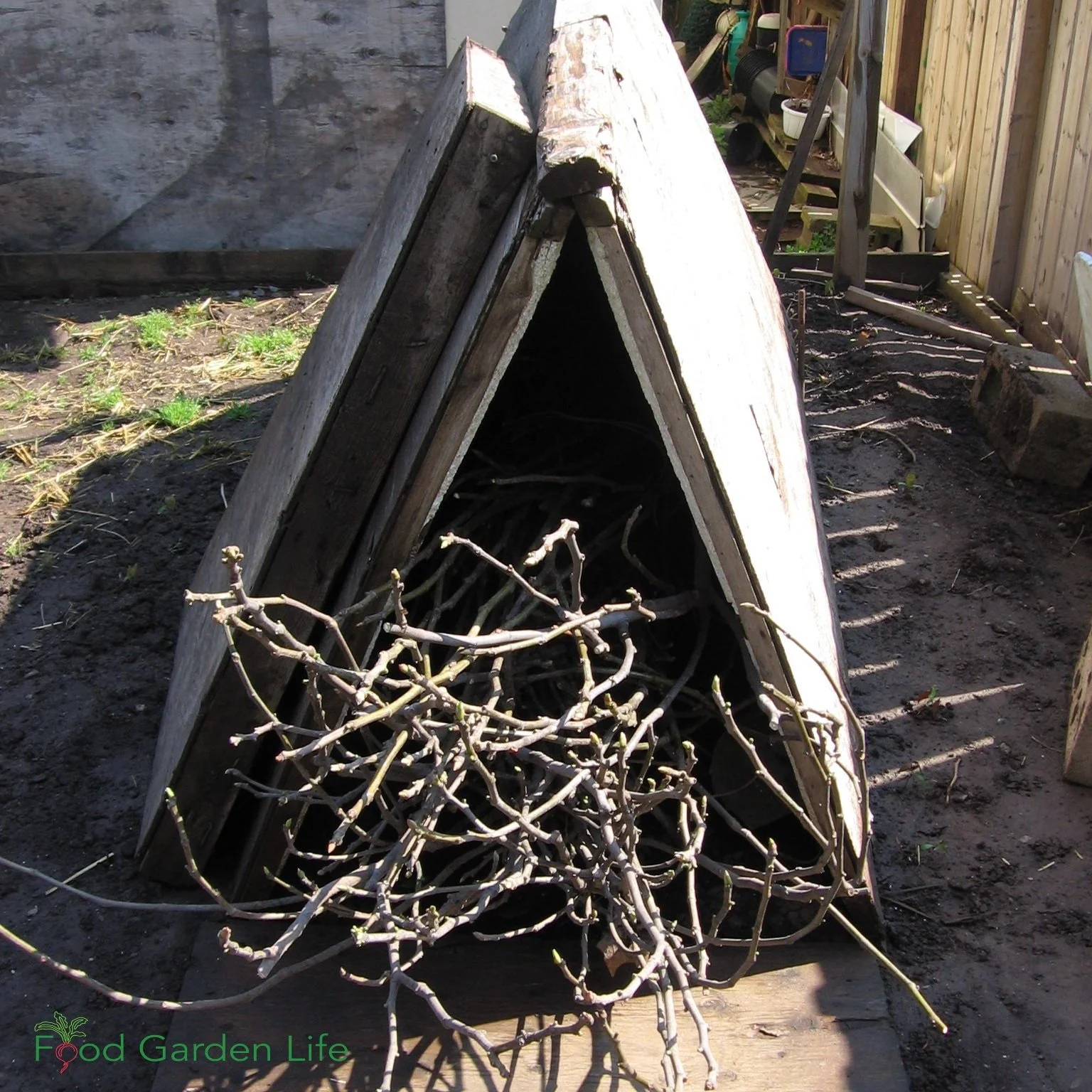 A fig bush bent over for winter, and covered with an insulated a-frame.