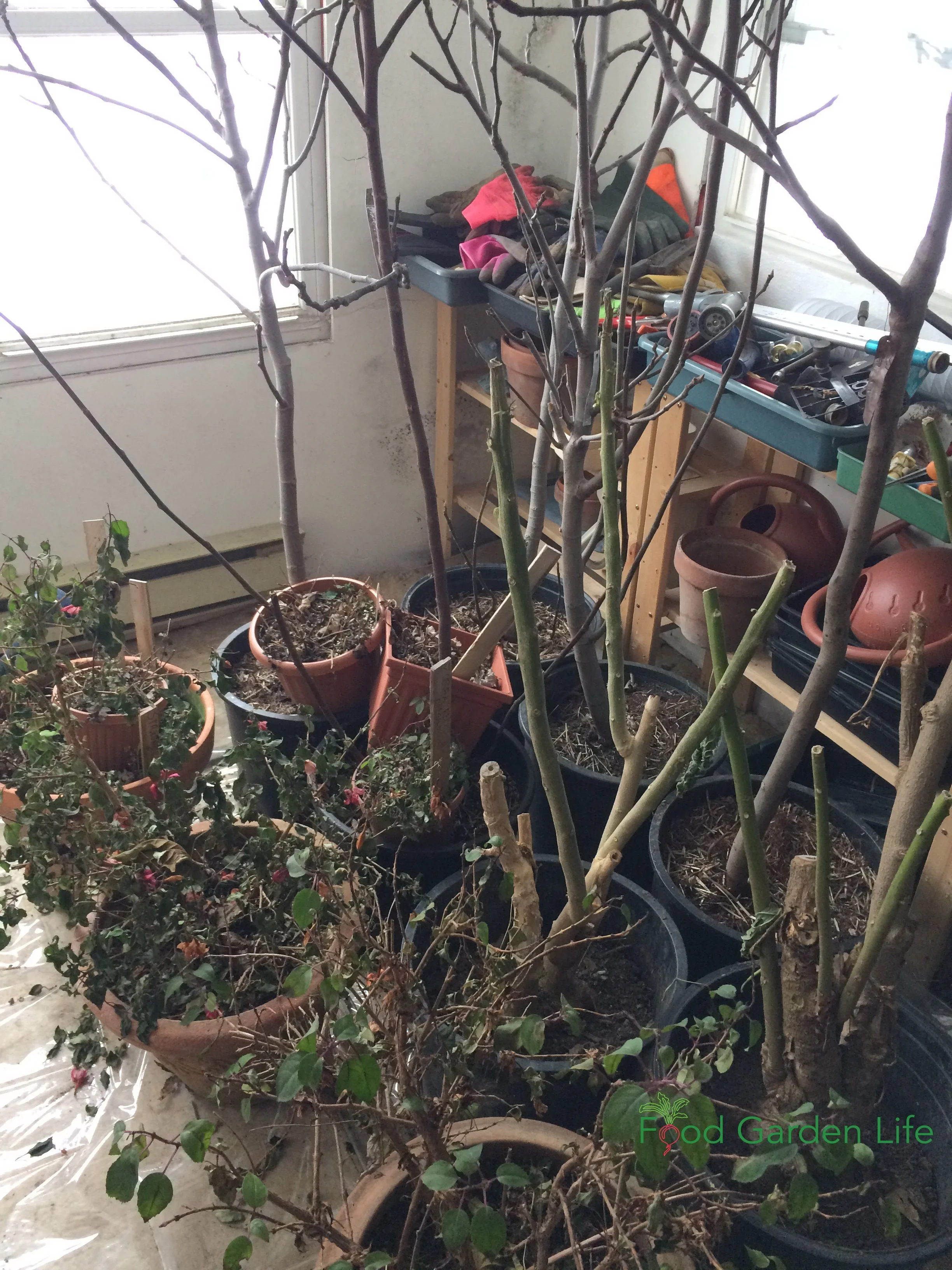 Dormant fig trees spending the winter in my cold, bright potting shed.