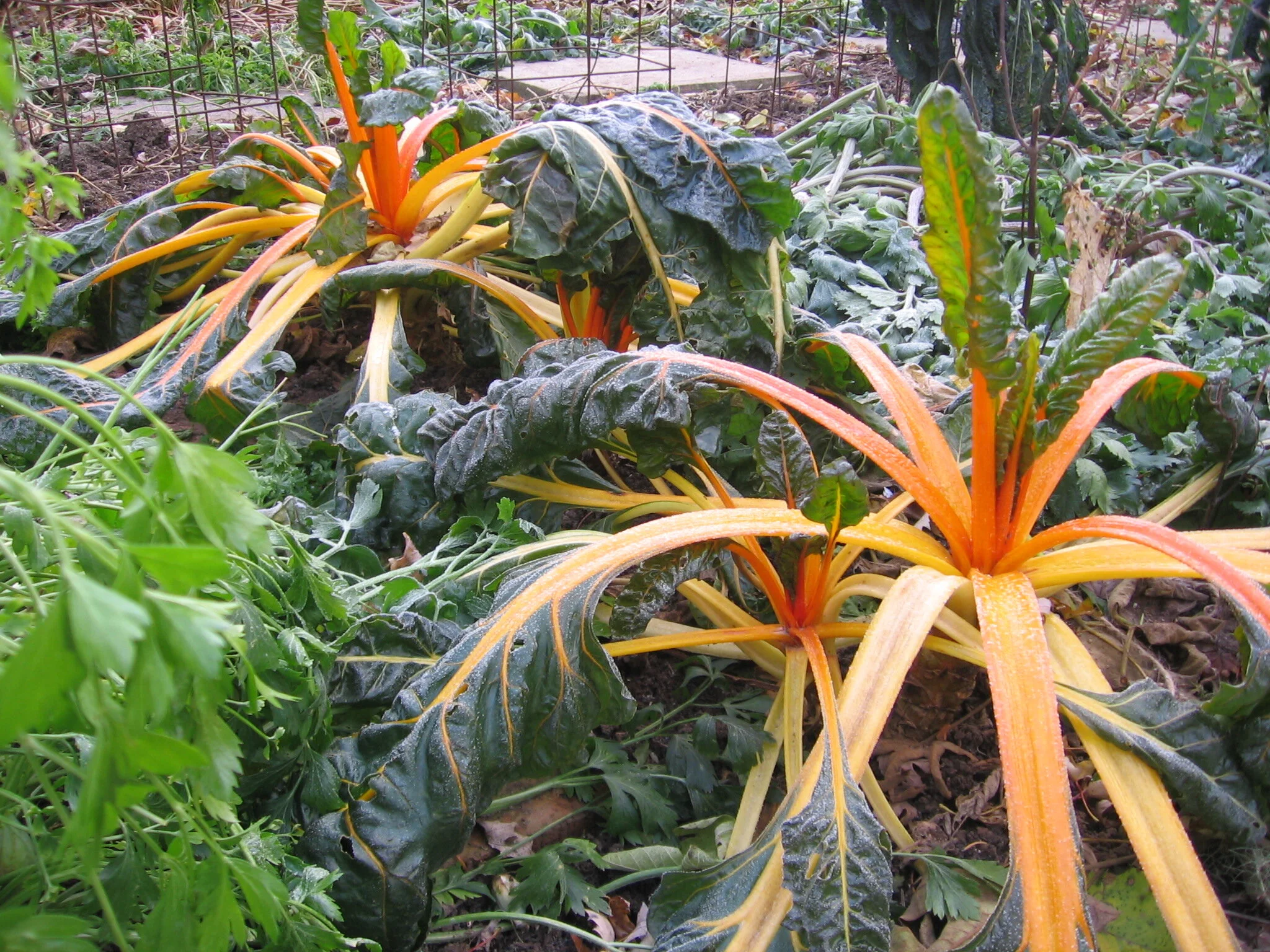 Swiss chard paints this part of my garden in yellows, reds, pink, and orange.